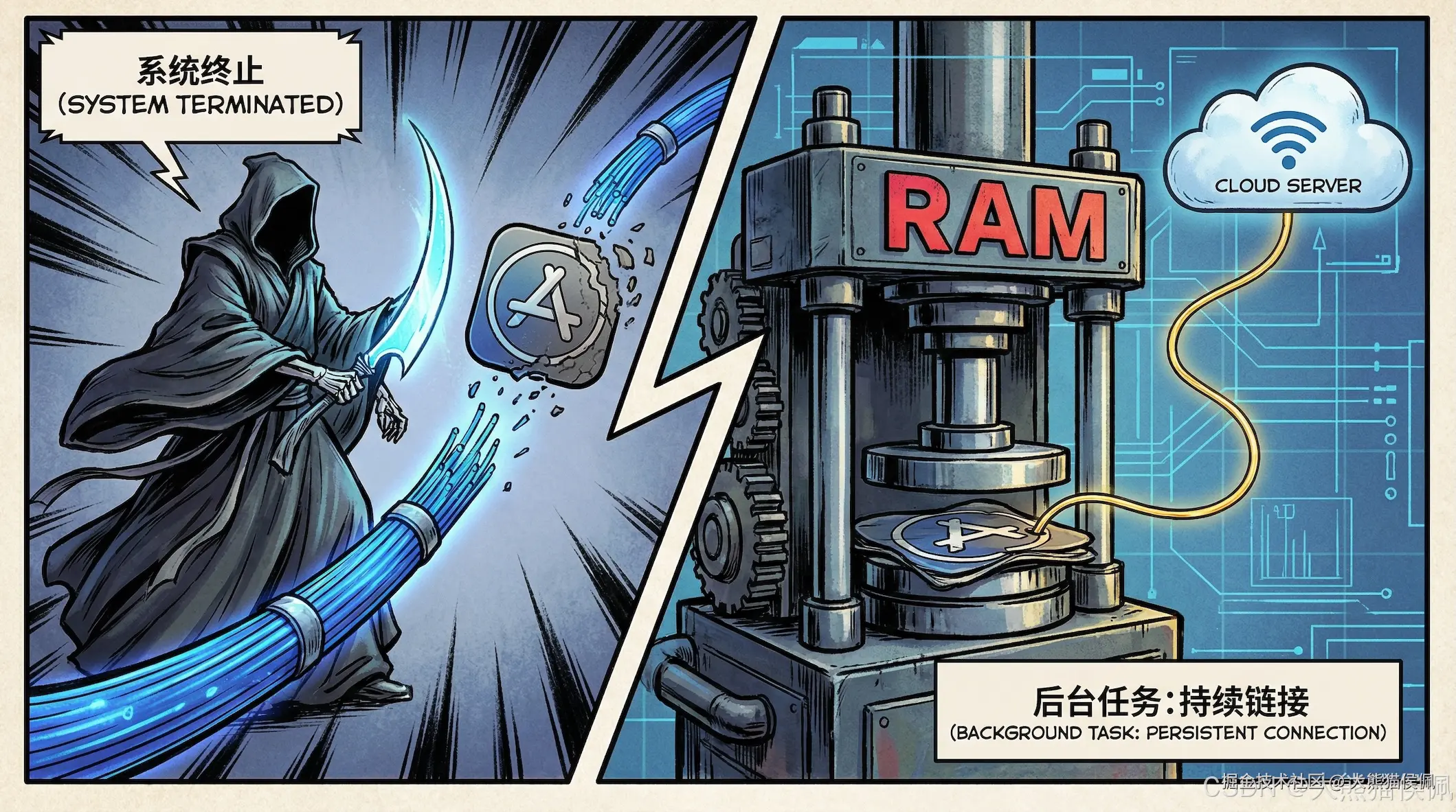 最近老李接了个大活儿,要为一个 App 开发 Background Uploading (后台上传)功能。这活儿最棘手的地方在于:你得确保当系统因为 RAM constraints(内存限制)或其他不可抗力把你的 App 挂起甚至杀掉时,这上传任务还得能像"借尸还魂"一样继续跑。