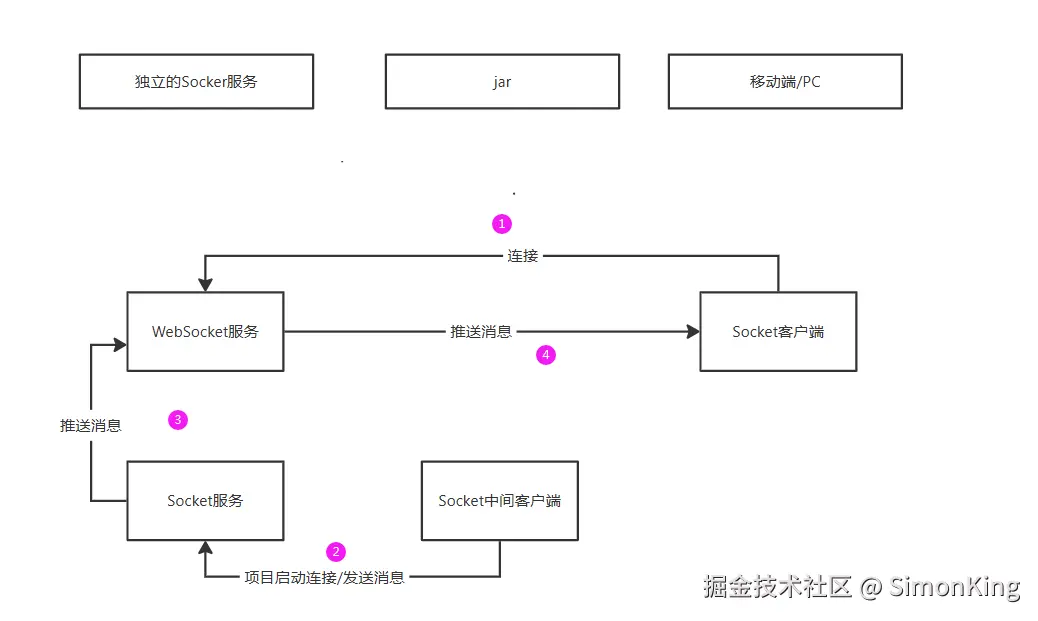 Socket中间客户端作为一个jar传递于业务项目中,用来代替WebSocket直接推送消息给Socket客户端。同时也会将WebSocket服务的IP和端口暴露给客户端。