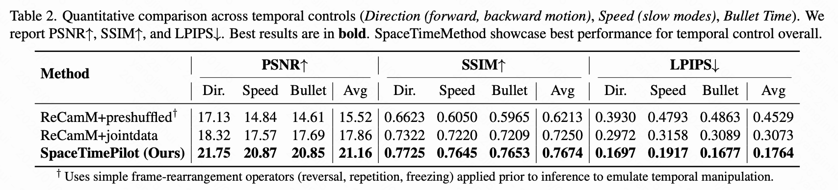 虽然帧混洗在简单场景中可能成功,但它无法解耦摄像机和时间控制。如下表 2 所示,这种方法表现出最弱的时间可控性。尽管结合静态场景数据集提高了性能,尤其是在子弹时间类别中,但依赖单一时间控制模式仍然不足以实现鲁棒的时间一致性。相比之下,SpaceTimePilot 在所有时间配置中始终优于所有基线。