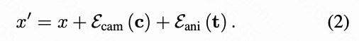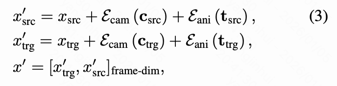 E_cam(c)编码摄像机轨迹,并进一步结合源感知摄像机条件化,将源视频 和目标视频 的摄像机姿态联合注入模型。 -