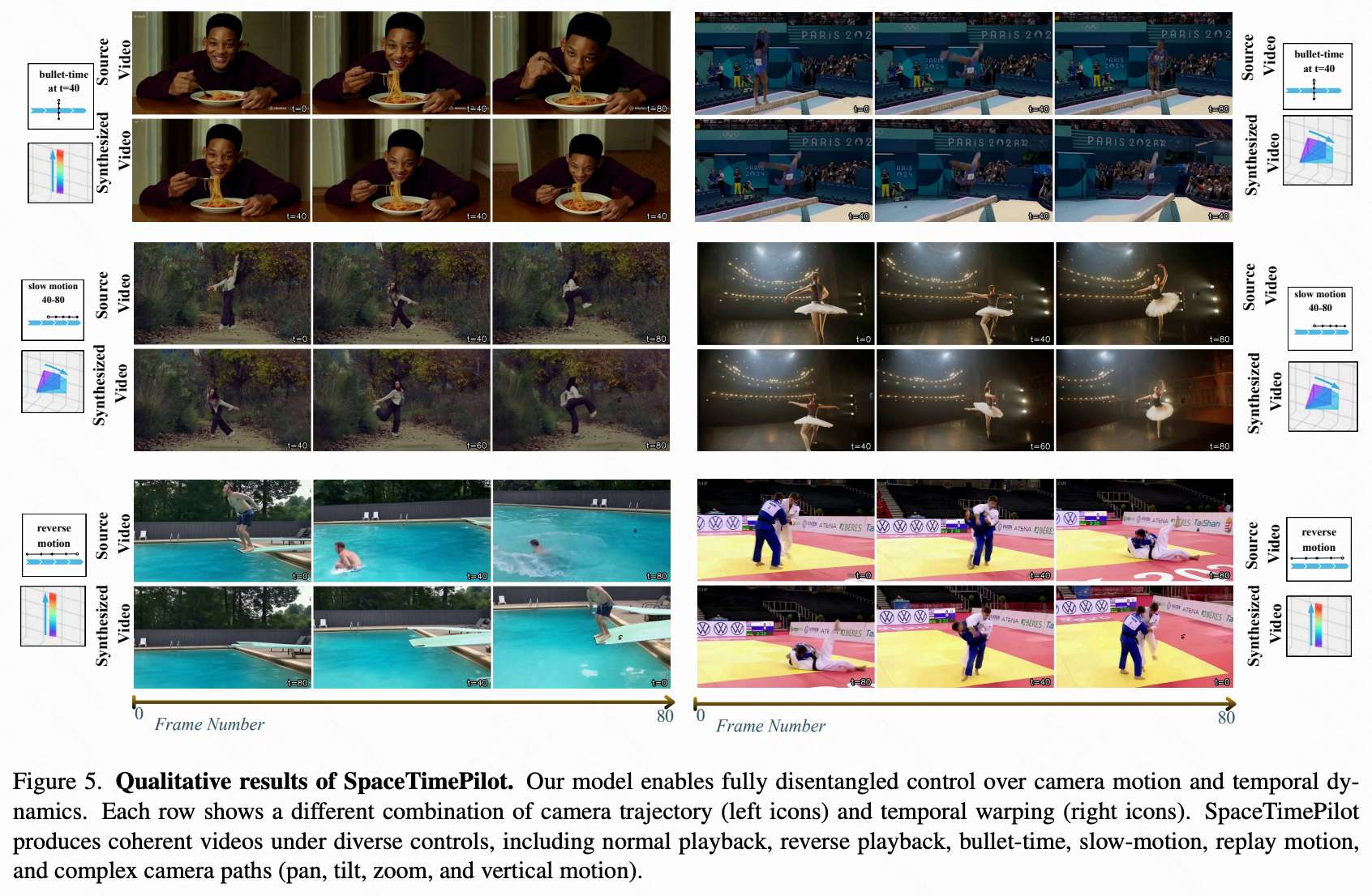 本文的方法 SpaceTimePilot 通过在生成过程中解耦空间和时间因素,实现了子弹时间(bullet-time)和从新视点重新计时播放等效果,如上图 1 所示。