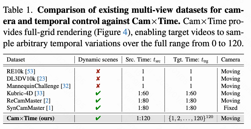 用于精确时空控制的合成 Cam×Time 数据集。虽然本文的时间扭曲增强鼓励空间和时间因素之间强烈的解耦,但实现细粒度和连续控制------即平滑精确地调整时间动态------受益于系统覆盖这两个维度的数据集。为此,本文构建了 Cam×Time,一个新的在 Blender 中渲染的合成时空数据集。给定摄像机轨迹和一个动画主题,Cam×Time 详尽地采样摄像机-时间网格,捕获跨越不同摄像机视角和时间状态组合 的每个动态场景,如下图 4 所示。源视频通过采样密集网格的对角线帧(下图 4(底部))获得,而目标视频通过更自由形式的连续序列采样获得。本文将 Cam×Time 与现有数据集进行比较,如下表 1 所示。虽然如[23, 32, 53]等是具有复杂摄像机路径注释的真实视频,但它们要么不提供时间同步的视频对,要么只提供静态场景对。合成多视图视频数据集提供动态视频对,但不允许训练时间控制。相比之下,Cam×Time 能够对摄像机运动和时间动态进行细粒度操作,从而实现子弹时间效果、运动稳定和灵活的控制组合。本文将 Cam×Time 的一部分指定为测试集,旨在将其用作可控视频生成的基准。本文将发布它以支持未来对细粒度时空建模的研究。