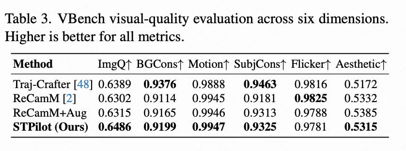 为了仅测量源摄像机条件化的影响,本文考虑了原始 ReCamMaster(ReCamM) 和两种变体。由于 ReCamMaster 最初是在源视频和目标视频的第一帧相同的数据集上训练的,因此模型总是复制第一帧,而不管输入摄像机姿态如何。为了公平起见,本文使用更多数据增强功能重新训练 ReCamMaster,以包括不相同的起始帧,表示为 ReCamM+Aug。接下来,本文根据等式 3 额外使用源摄像机 对模型进行条件化,表示为 ReCamM+Aug+。最后,本文还报告了 TrajectoryCrafter的结果。