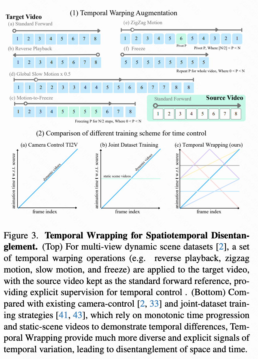 提出时间扭曲训练方案: 针对缺乏具有连续时间变化的配对视频数据集的问题,本文设计了一种简单有效的时间扭曲训练方案,通过增强现有多视角数据集来模拟多样化的时间差异,从而帮助模型学习时间控制并实现时空解耦。