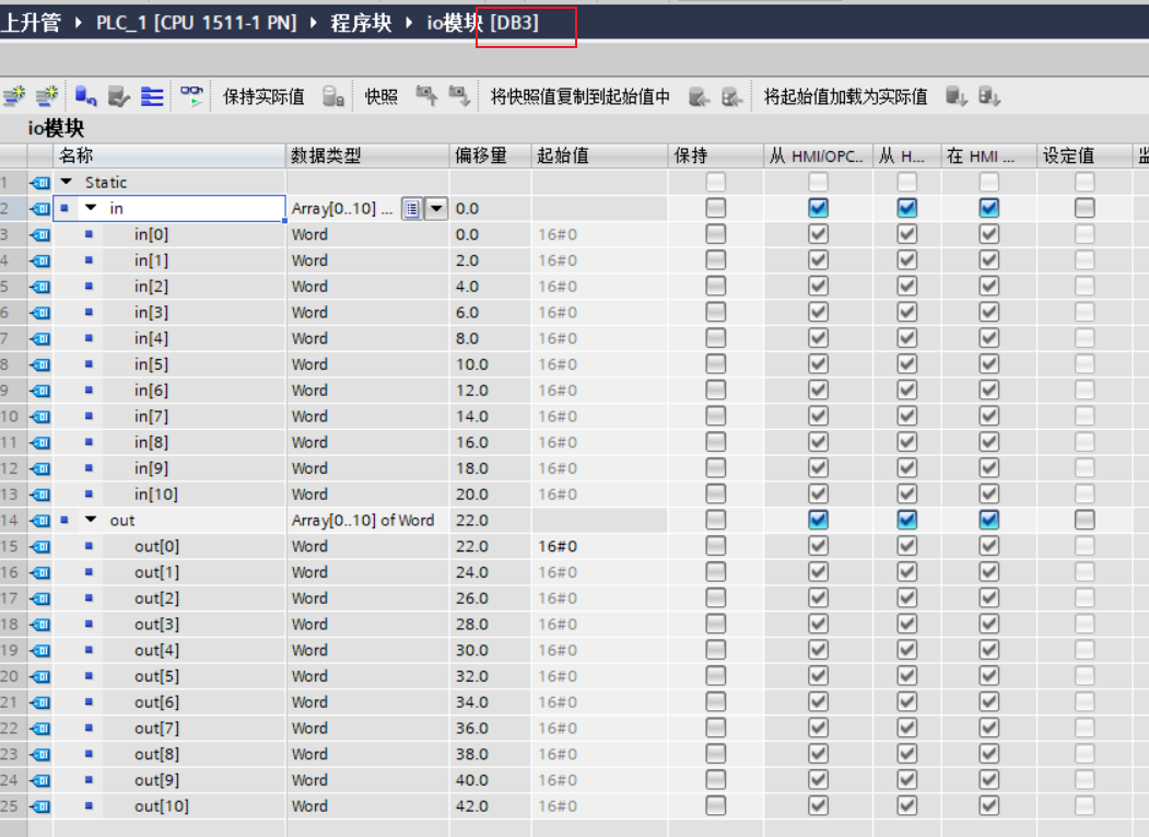2. 新建一个数据块,用于接收和发送数据。因为接收到的数据是16位无符号数据,所以建两个数组,每个里面放10个字。 方便管理
