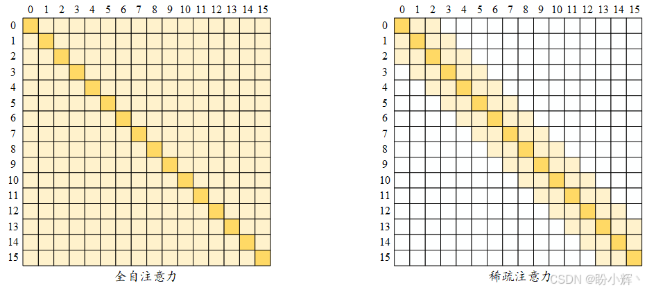 下图展示了全自注意力 (Full self-attention, 即完整的经典自注意力机制) 和稀疏注意力 (sparse attention),图中,行对应输出位置,列对应输入位置。全自注意力模型会直接在任意两个位置之间传递信息。而在图中右侧所示的局部滑动窗口注意力(即稀疏注意力)中,空白单元格表示相应的输入-输出位置之间没有交互。图中的稀疏模型基于固定模式,这些模式是手动设计的规则。具体地说,局部滑动窗口注意力是最早提出的稀疏化方法之一,也称为基于局部的固定模式方法,它假设每个位置有用的信息通常位于其邻近位置。每个查询词元会关注当前位置左边和右边各2个键词元,即窗口大小为 4。这一规则以相同的方式应用于 Transformer 的每一层,我们也可以令窗口大小随着层数的增加而增大。下图简要展示了全自注意力(左)和稀疏注意力(右)之间的区别: