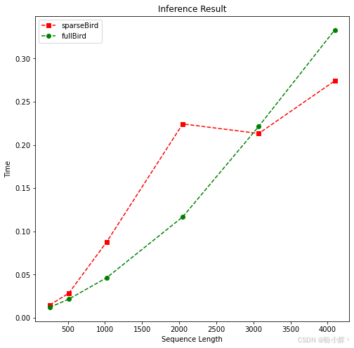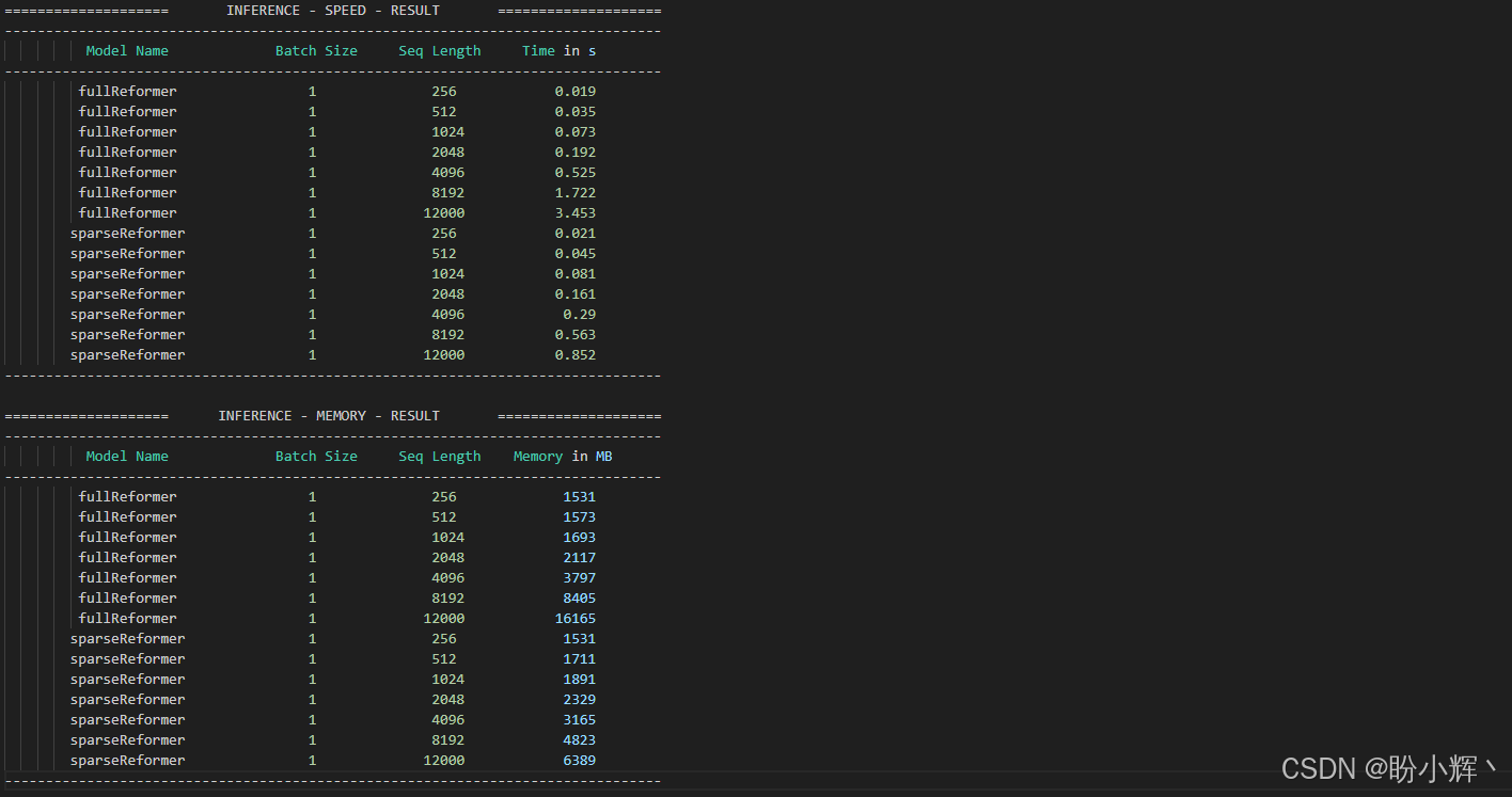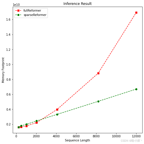 输出如下所示,可以清晰地看到全自注意力模型和稀疏模型分别呈线性和平方级内存复杂度: