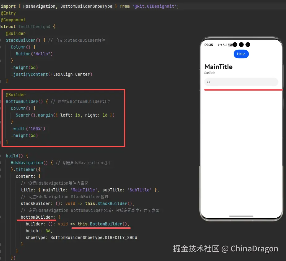 // 设置HdsNavigation BottomBuilder区域,包括设置高度,显示类型