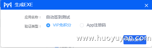 验证方式:支持 VIP 免积分、App 注册码两种验证类型,完成验证后系统将自动生成 EXE 文件并保存至指定路径;