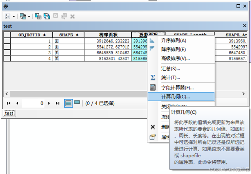 在字段"投影面积"右键---计算几何。注意:字段"投影面积"数据类型为双精度。