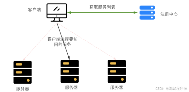⽐如Spring Cloud的Ribbon,请求发送到客⼾端,客⼾端从注册中⼼(⽐如Eureka)获取服务列表,在发送请求前通过负载均衡算法选择⼀个服务器,然后进⾏访问。