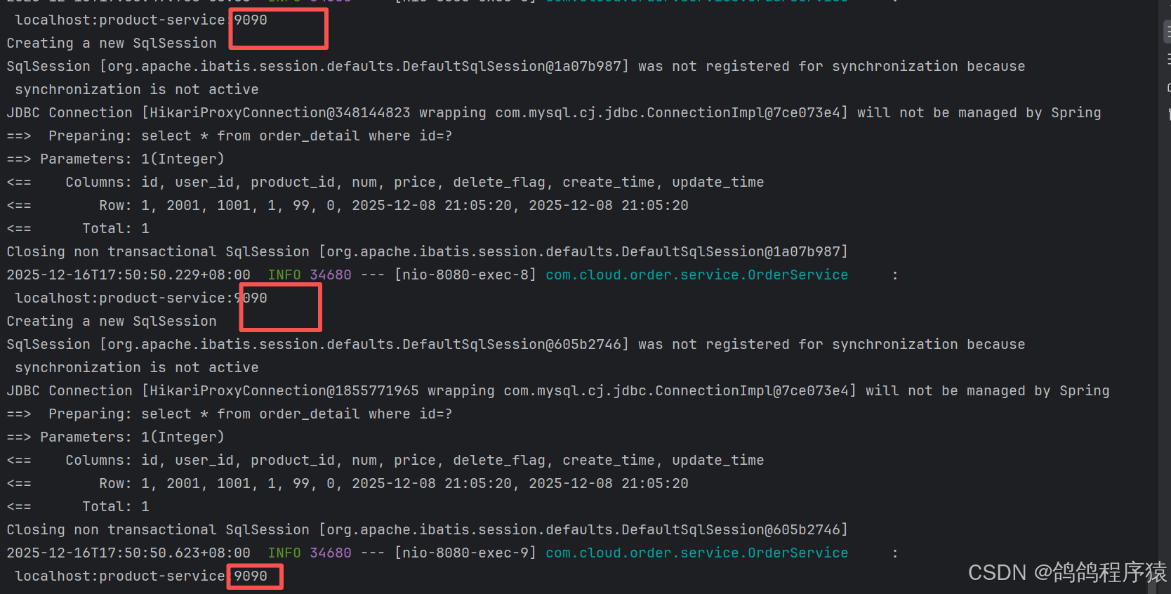 后端多次访问http://127.0.0.1:8080/order/1,端口大部分都是9090,可以看到流量分配是不均匀的。