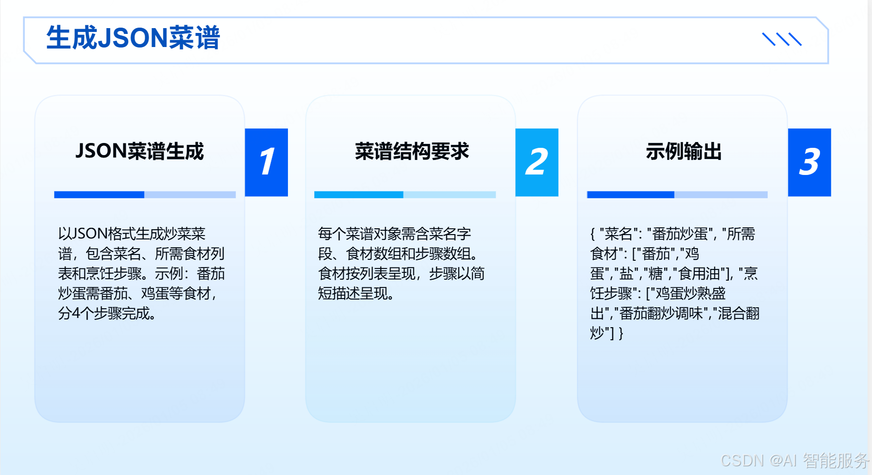 - 任务:设计一个 Prompt,要求模型以 JSON 格式生成一份简单的炒菜菜谱,每个菜谱对象包含菜名、所需食材(以列表形式呈现)、烹饪步骤(每个步骤以简短描述呈现)。