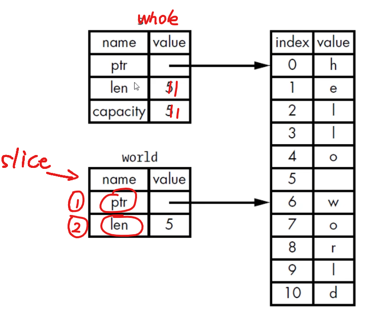 rustfn main() { let mut s1 = String::from("he llo "); let first = &s1[0..2]; let last = &s1[3..6]; // 输出he println!("the first word is {}", first); // 输出llo println!("the last word is {}", last); } -