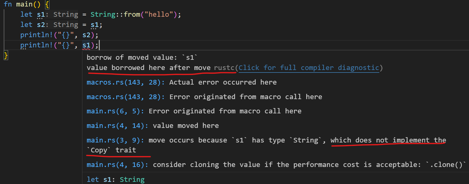 rustlet s1 = String::from("hell0"); // 这个s2=s1只是单纯的赋值了栈上的ptr,len和capacity let s2 = s1; println!("{}",s2); // s1已经失效了,编译器会自动报错 println!("{}",s1);