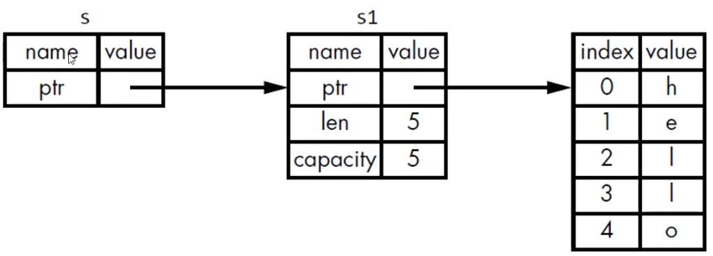 这个s2=s1只是单纯的赋值了栈 上的ptr,len和capacity