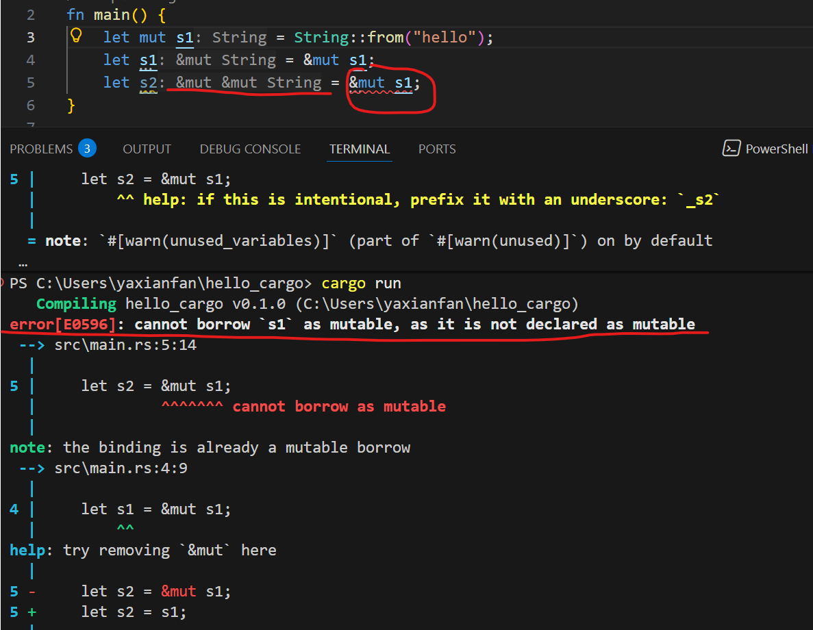 rust// 观察caculate_length1和caculate_length2有什么不同? fn caculate_length1(s: String) -> (String, usize) { // 这里只是借用,下面会提到 let len =s.len(); return (s, len); } fn caculate_length2(s: String) -> (String, usize) { // 会编译报错,显示s.len()会报错,s已经被move,所有s.len()没办法执行 return (s, s.len()); }