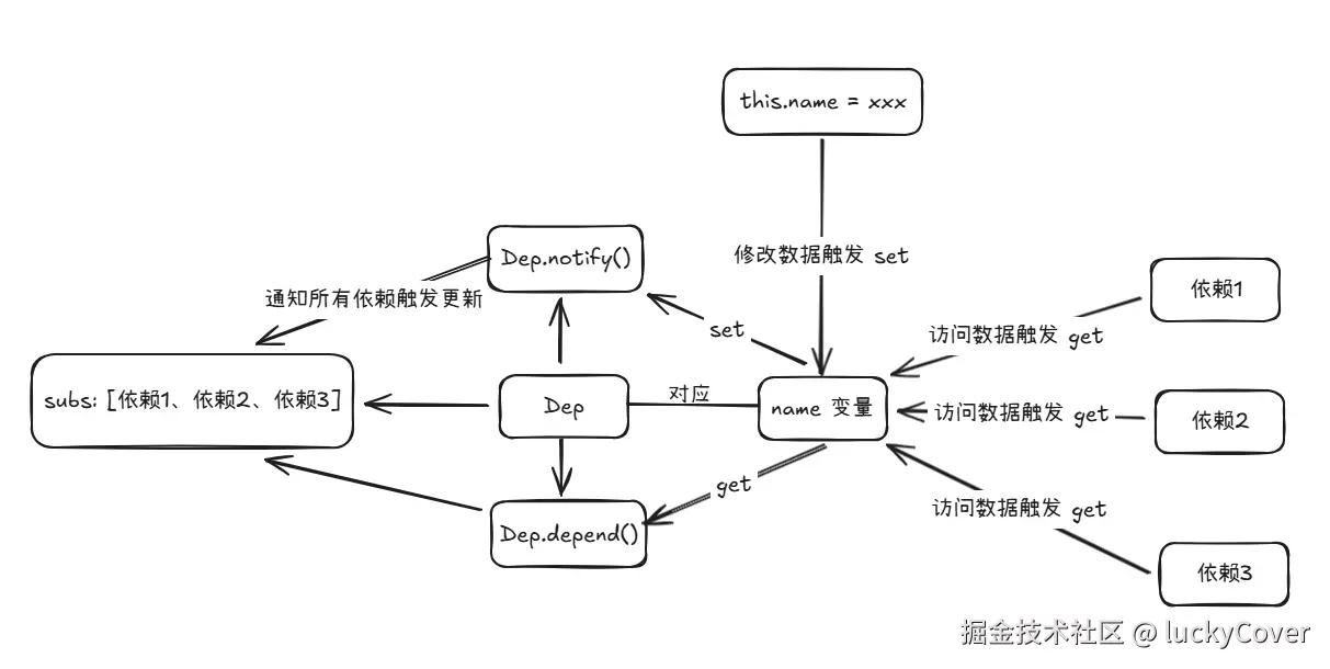 在 Vue 里每个数据都会对应一个 Dep 实例,当有依赖(订阅者)访问这个数据时,会触发 get 函数,get 函数中通过 depend 函数收集访问这个数据的依赖(订阅者),在这个数据发生变更触发 set 函数时,会调用 notify 函数来通知所有依赖(订阅者)。大致流程如下图所示: