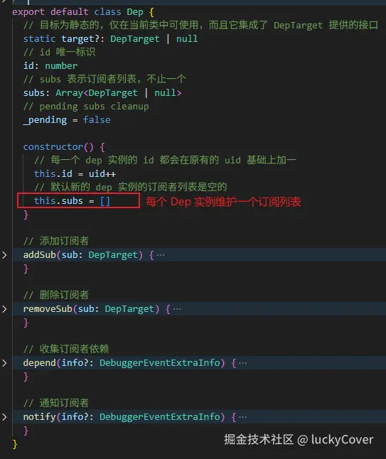 那么在 Vue 里,有一个专门表示发布者的类,叫 Dep,通过 new Dep() 的方式可以创建一个 Dep 实例(即创建一个发布者),这个 Dep 实例(发布者)中维护着一个 subs 列表(订阅者列表)。下面贴出这个 Dep 类的源代码,此处仅需明白流程就行,具体源码会在后面文章中分析。