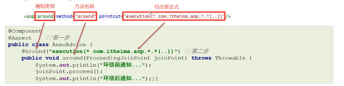 <aop:around method-"around" Pointcut="execution(* com.itheima.aop.*,*(..))"/></aop:aspect>
