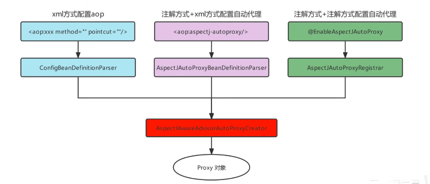 之前在使用xml配置AOP时,是借助的Spring的外部命名空间的加载方式完成的,使用注解配置后,就抛弃了< aop:config>标签,而该标签最终加载了名为AspectAwareAdvisorAutoProxyCreator的BeanPostProcessor,最终,在该BeanPostProcessor中完成了代理对象的生成。