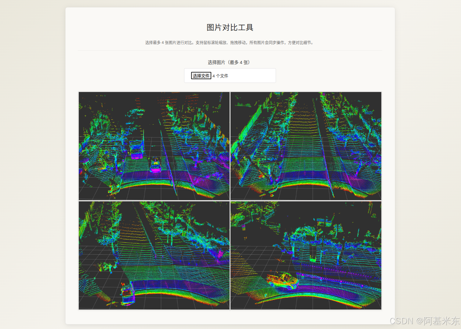 在工作和生活中,有时候我们需要同时对比几张图片同一位置的细微区别,挑选出最好的一张图片。因此我做了一个网页工具,可以同时对比 2-4 张图片,支持同步缩放、平移、移动操作。同时也支持触摸事件,因此在手机、平板等移动端也可以使用哦!
