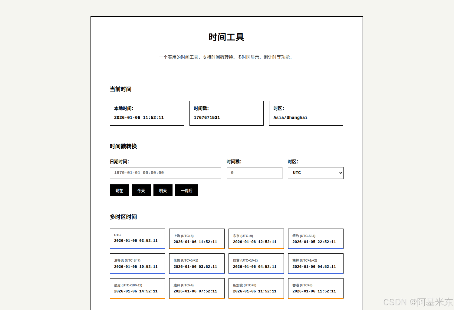 对于普通人来讲,时间戳的概念有点陌生。不过,对于软件工程师来说,时间戳是一个经常接触的东西,例如在工作中我们经常需要观察、分析带时间戳的日志信息。因此,我做了一个小工具,支持时间戳转换、多时区显示、倒计时、年度进度等时间相关功能。界面设计使用 Kindle 电纸书风格,看起来干净清爽,就像时间这位老朋友一样,历久弥新。