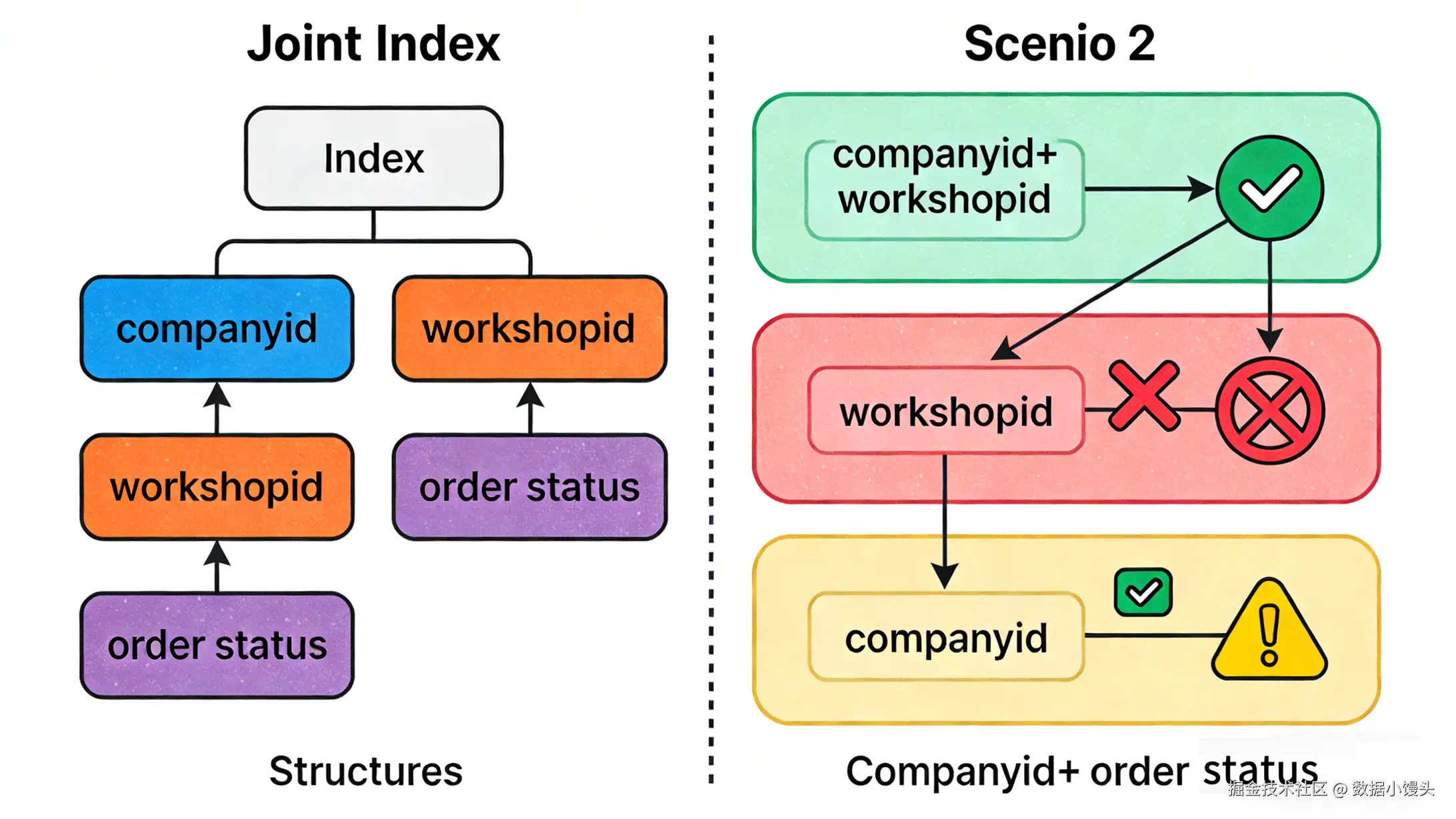 - 但如果你只知道某个人"名伟"(workshop_id),你没法利用目录,只能从第一页翻到最后一页(全表扫描)。