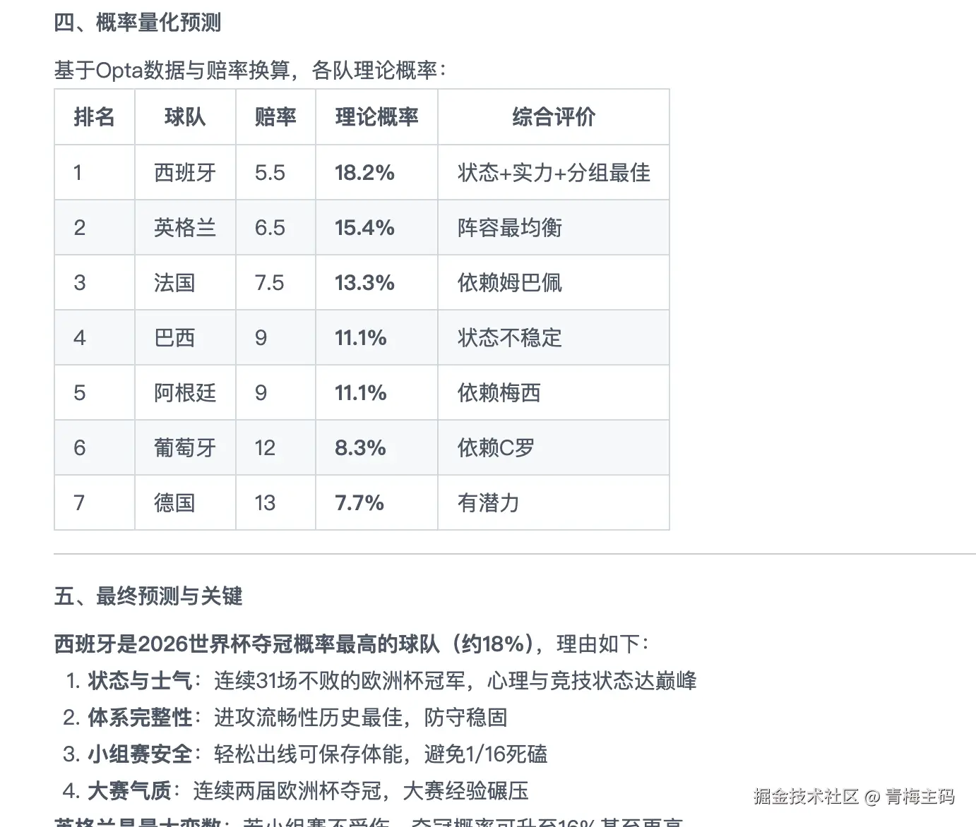 我问:"2026世界杯谁夺冠概率最高?给出详细分析。"