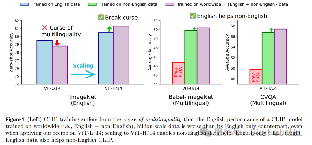 Fig. 1 :左图显示多语言诅咒现象------使用全球数据训练的 ViT-L/14 在英语 ImageNet 上表现不如仅英文模型;右图则展示了 ViT-H/14 打破诅咒的情况,英语与非英语任务均获提升。