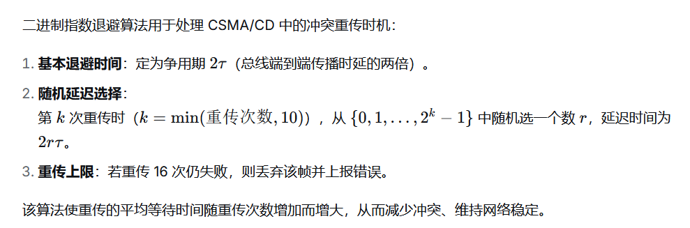 争用期(冲突窗口) :在以太网中,从发送开始到最远端的信号返回,需要 端到端往返传播时延的 2 倍时间((2\tau))。在这段时间内,发送站可能检测到冲突。因此,这段时间被称为"争用期"。
