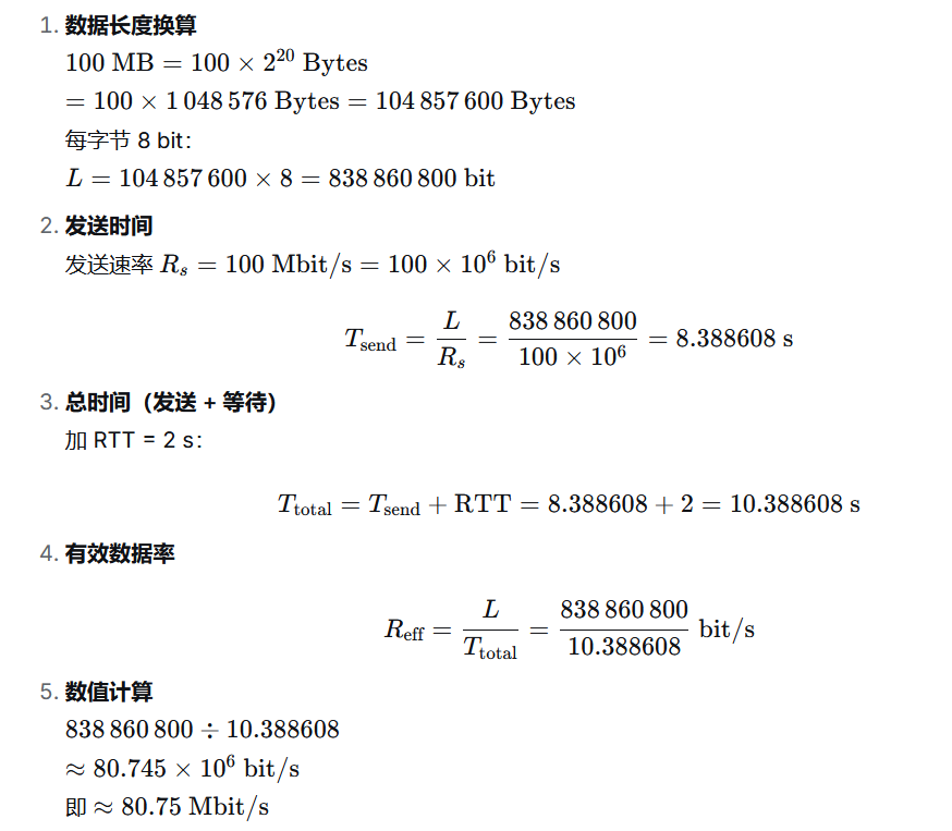 有效数据率 = 数据长度 /(发送时间 + RTT)≈ 80.7 Mbit/s