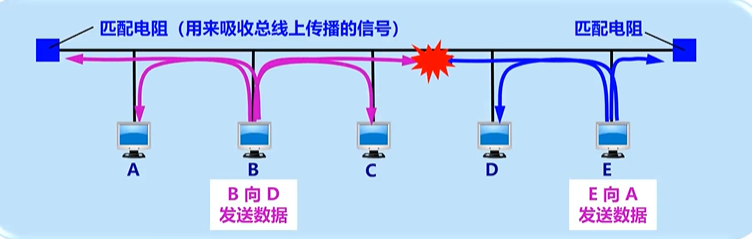 - 多点接入:说明这是总线型网络。许多计算机以多点接入的方式连接在一根总线上。