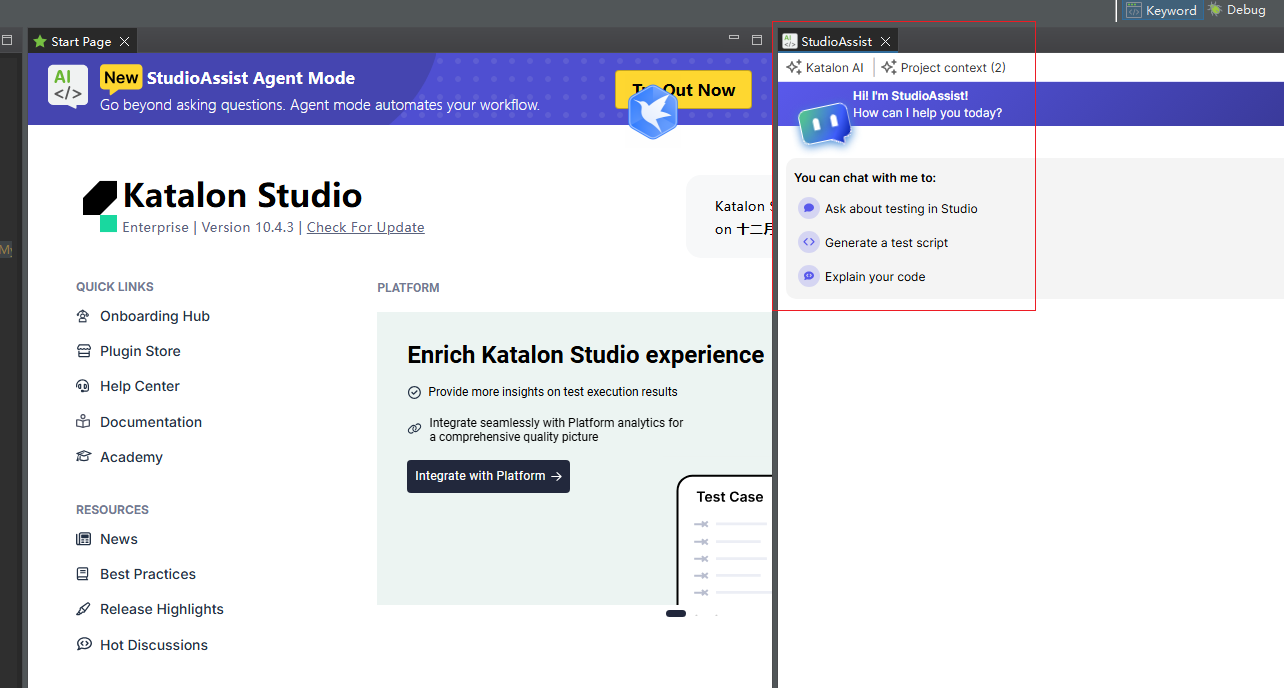 自Katalon Studio 10.3.2版本起,StudioAssist的聊天窗口引入了两种可切换的模式,以满足不同场景下的需求: