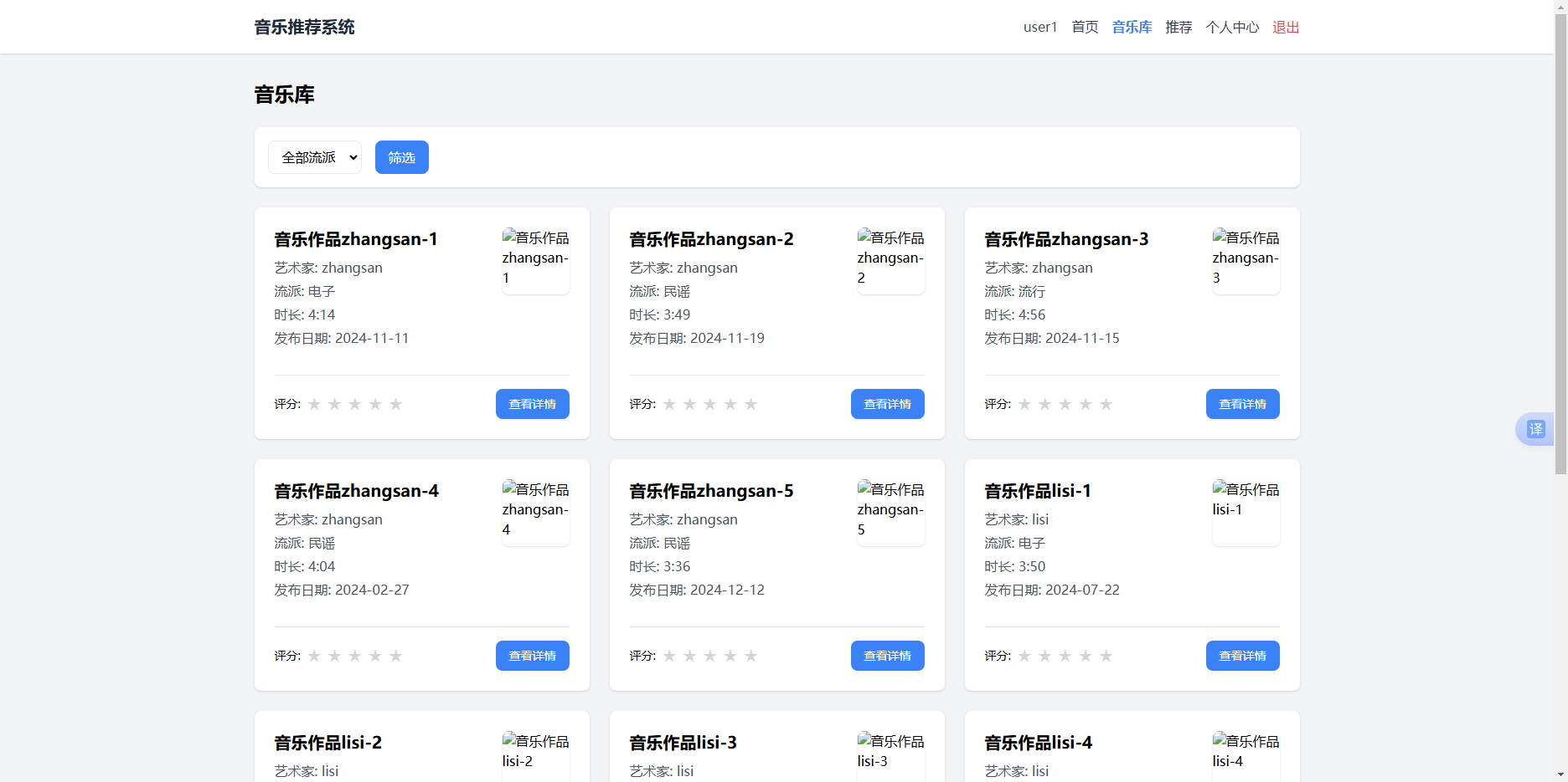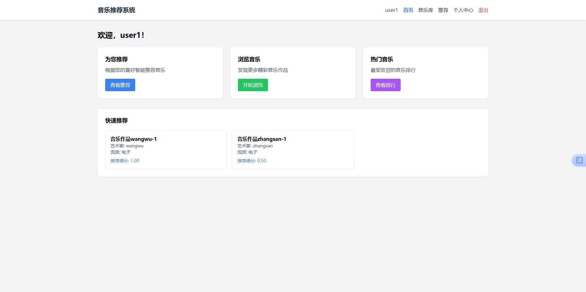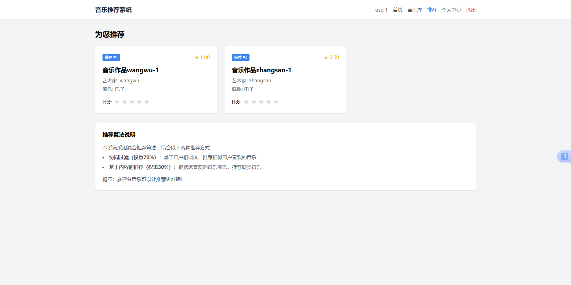 - 查看个性化推荐(需要先评分至少2首音乐才能生成推荐)