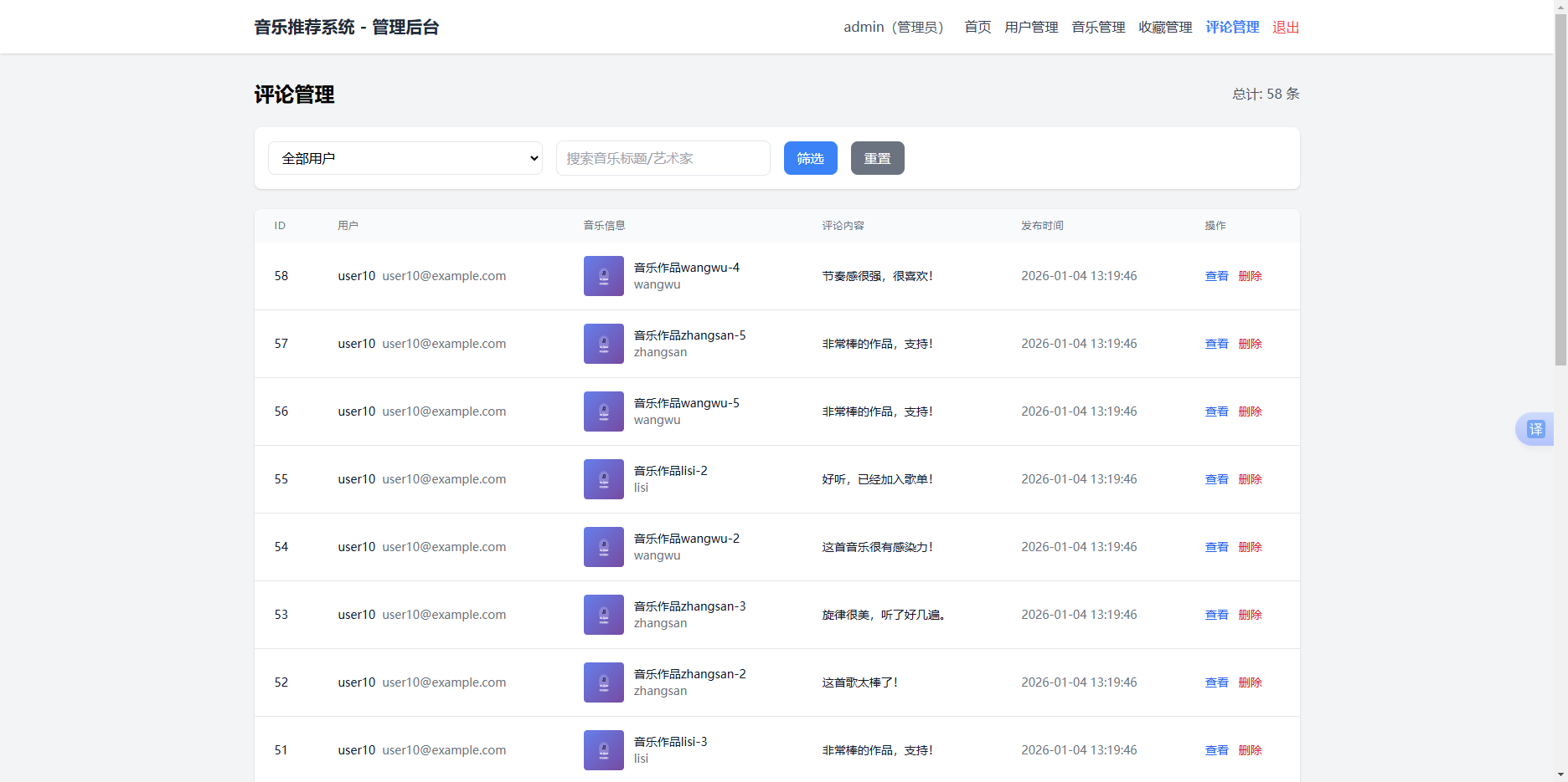 - ✅ 评论管理(查看列表、按用户筛选、搜索音乐、查看详情、删除评论)