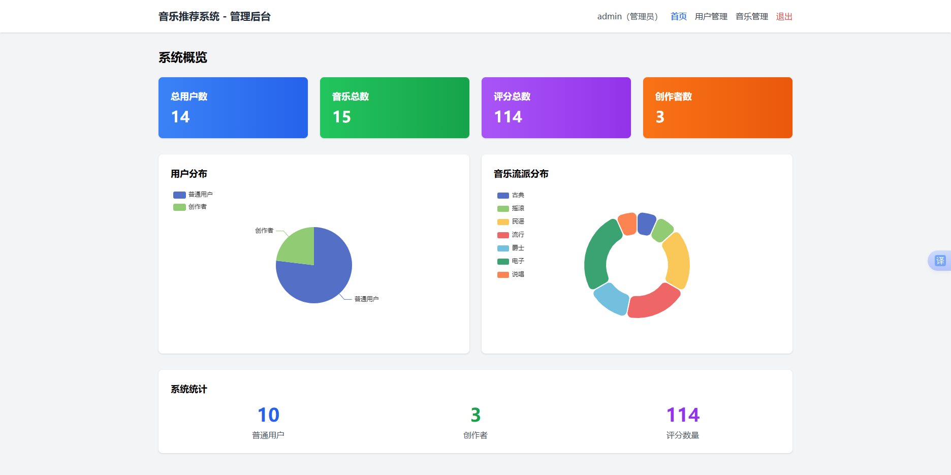- ✅ 系统数据可视化(用户分布、音乐流派分布、系统运营数据)