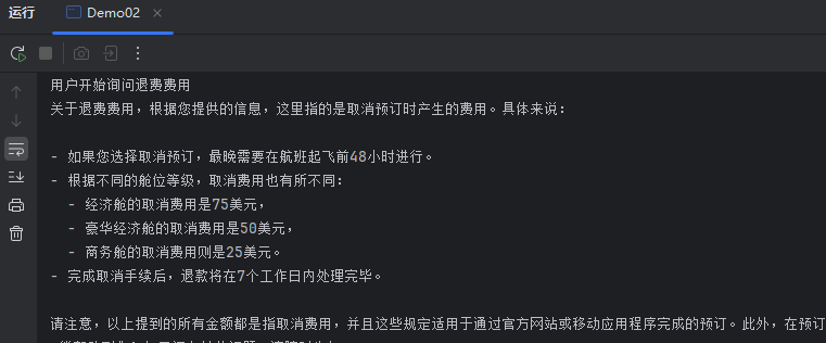 javaimport dev.langchain4j.community.model.dashscope.QwenEmbeddingModel; import dev.langchain4j.data.embedding.Embedding; import dev.langchain4j.data.segment.TextSegment; import dev.langchain4j.store.embedding.EmbeddingSearchRequest; import dev.langchain4j.store.embedding.EmbeddingSearchResult; import dev.langchain4j.store.embedding.inmemory.InMemoryEmbeddingStore; public class Demo02 { public static void main(String[] args) { InMemoryEmbeddingStore<TextSegment> embeddingStore = new InMemoryEmbeddingStore<>(); QwenEmbeddingModel embeddingModel= QwenEmbeddingModel.builder() .apiKey("sk-xxxxxx") .build(); // 利用向量模型进行向量化, 然后存储向量到向量数据库 TextSegment segment1 = TextSegment.from(""" 预订航班: - 通过我们的网站或移动应用程序预订。 - 预订时需要全额付款。 - 确保个人信息(姓名、ID 等)的准确性,因为更正可能会产生 25 的费用。 """); Embedding embedding1 = embeddingModel.embed(segment1).content(); embeddingStore.add(embedding1, segment1); // 利用向量模型进行向量化, 然后存储向量到向量数据库 TextSegment segment2 = TextSegment.from(""" 取消预订: - 最晚在航班起飞前 48 小时取消。 - 取消费用:经济舱 75 美元,豪华经济舱 50 美元,商务舱 25 美元。 - 退款将在 7 个工作日内处理。 """); Embedding embedding2 = embeddingModel.embed(segment2).content(); embeddingStore.add(embedding2, segment2); // 需要查询的内容 向量化 Embedding queryEmbedding = embeddingModel.embed("退票要多少钱").content(); // 去向量数据库查询 // 构建查询条件 EmbeddingSearchRequest build = EmbeddingSearchRequest.builder() .queryEmbedding(queryEmbedding) .maxResults(1)//取最符合的几条数据,这里是1条 .minScore(0.6)//只有符合0.6的才会选用,也可以不设置 .build(); // 查询 EmbeddingSearchResult<TextSegment> segmentEmbeddingSearchResult = embeddingStore.search(build); segmentEmbeddingSearchResult.matches().forEach(embeddingMatch -> { System.out.println(embeddingMatch.score()); // 0.8144288515898701 System.out.println(embeddingMatch.embedded().text()); // I like football. }); } } -