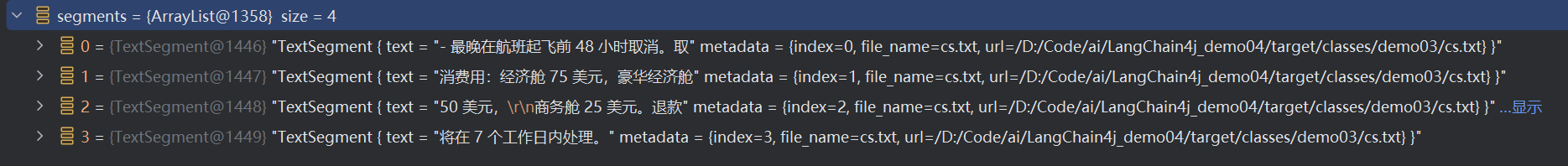 javaimport dev.langchain4j.data.document.Document; import dev.langchain4j.data.document.loader.ClassPathDocumentLoader; import dev.langchain4j.data.document.parser.TextDocumentParser; import dev.langchain4j.data.document.splitter.DocumentByCharacterSplitter; import dev.langchain4j.data.segment.TextSegment; import java.util.List; public class Demo03 { public static void main(String[] args) { //文档读取 Document document = ClassPathDocumentLoader. loadDocument("demo03/cs.txt", new TextDocumentParser()); // String text = document.text(); // System.out.println(text); DocumentByCharacterSplitter splitter = new DocumentByCharacterSplitter( 20, // 每段最长字数 10 // 自然语言最大重叠字数 ); List<TextSegment> segments = splitter.split(document); System.out.println(segments); } } -