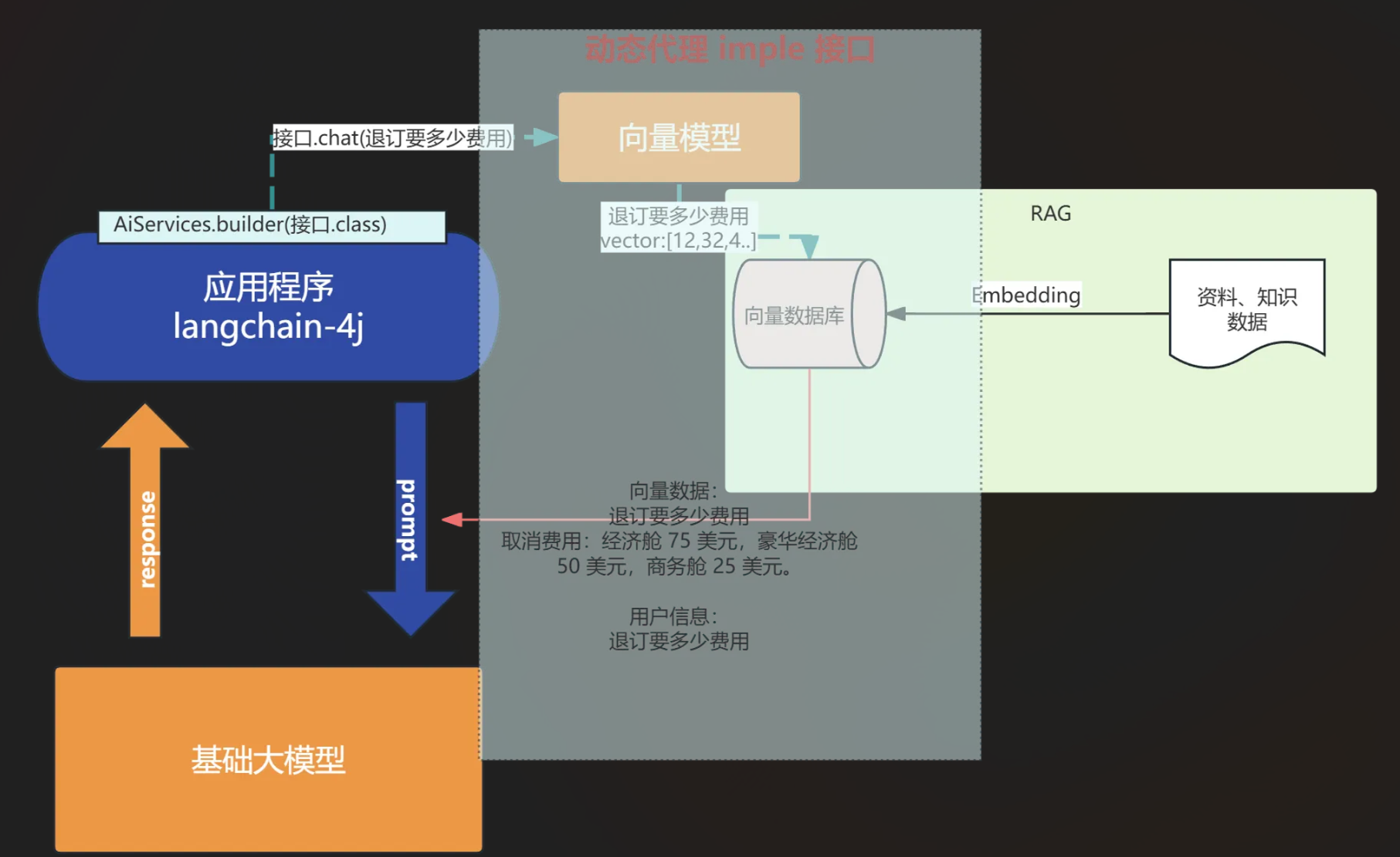 java...... interface Assistant { String chat(String message); } ChatLanguageModel model = QwenChatModel .builder() .apiKey("sk-xxxxxxx") .modelName("qwen-max") .build(); ContentRetriever contentRetriever = EmbeddingStoreContentRetriever.build .embeddingStore(embeddingStore) //向量数据库 .embeddingModel(embeddingModel) //向量模型 .maxResults(5) // 最相似的5个结果 .minScore(0.6) // 只找相似度在0.6以上的内容 .build(); // 为Assistant动态代理对象 chat ---> 对话内容存储ChatMemory----> 聊天记录ChatMemory取出来 Assistant assistant = AiServices.builder(Assistant.class) .chatLanguageModel(model) .contentRetriever(contentRetriever) //内容检索器 .build(); System.out.println("用户开始询问退费费用"); System.out.println(assistant.chat("退费费用")); -