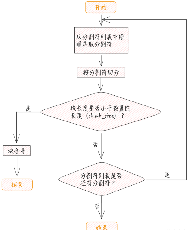 - 首先按照指定的分割符进行切分,切分过之后,如果块本身的长度小于 chunk_size 的大小,则触发合并逻辑。在进行合并时,遵循下面的规则:
