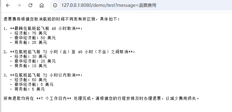 - 最晚在航班起飞前 48 小时取消。取消费用:经济舱 75 美元,豪华经济舱 50 美元, 商务舱 25 美元。退款将在 7 个工作日内处理。 按照chunksize可能会分隔成: -最晚在航班起飞前 48 小时取消。取消费用:经济舱 7 5 美元,豪华经济舱...... 如果设置了重叠可能会: -最晚在航班起飞前 48 小时取消。取消费用:经济舱 75 美元,豪华经济舱 50 美元,商务舱 25 美元。 -取消费用:经济舱 75 美元,豪华经济舱 50 美元,商务舱 25 美元。退款将在 7 个工作日内处理。 -