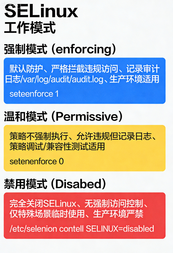 - [一、SELinux 核心作用与工作模式](#一、SELinux 核心作用与工作模式)