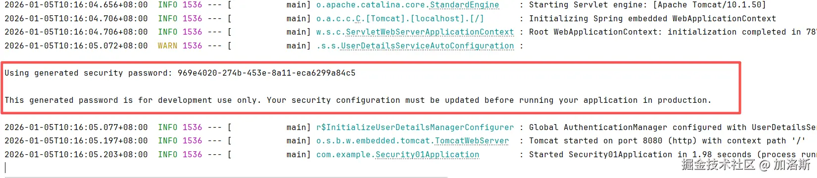 然后启动项目,在启动日志那块,我们可以看到生成了一串莫名其妙的东西,这串东西就是SpringSecurity自动为我们生成的初始密码。