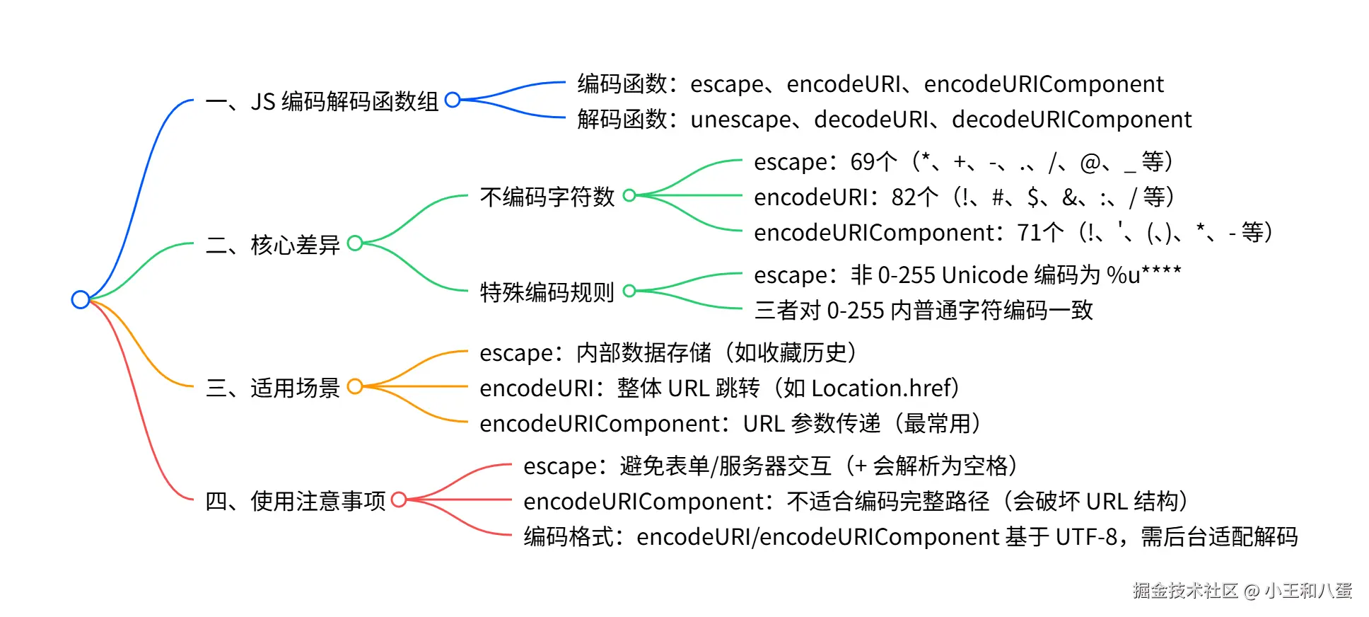 JavaScript 中有 escape、encodeURI、encodeURIComponent 三个编码函数及对应的 unescape、decodeURI、decodeURIComponent 解码函数,三者编码范围不同(不编码字符数分别为 69 个、82 个、71 个),适用场景有别:encodeURIComponent 因能编码特殊字符且适配 UTF-8 解码,是最常用的参数传递工具;encodeURI 适用于整体 URL 跳转,不编码 URL 关键分隔符;escape 适用于内部数据存储(如收藏历史),编码非 ASCII 字符为 % u**** 格式,且应尽量避免在表单或服务器交互中使用。