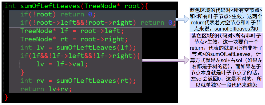 cppclass Solution{ public: int sumOfLeftLeaves(TreeNode* root){ if(!root) return 0; if(!root->left&&!root->right) return 0; TreeNode* lf = root->left; TreeNode* rt = root->right; int lv = sumOfLeftLeaves(lf); if(lf&&!lf->left&&!lf->right){ lv = lf->val; } int rv = sumOfLeftLeaves(rt); return lv+rv; } };迭代法: