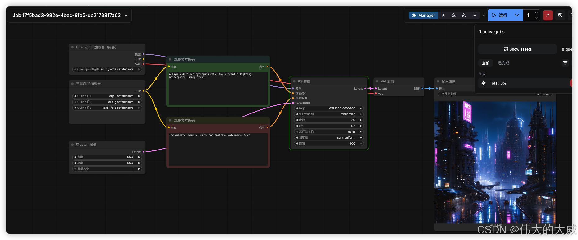clip_l,clip_g和t5xxl_fp16。如果这三个没选对,生成的图片将无法理解你的 Prompt。 - Scheduler: sgm_uniform: Stable Diffusion 3 必须使用 SGM Uniform 调度器,否则画面会充满噪点。