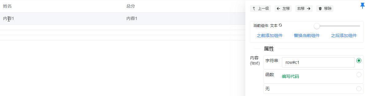 由于是给表格组件的默认插槽添加组件,因此列组件就是最合适的,可以看到组件面板中的表格列组件变为了橙色,高亮显示方便点选。