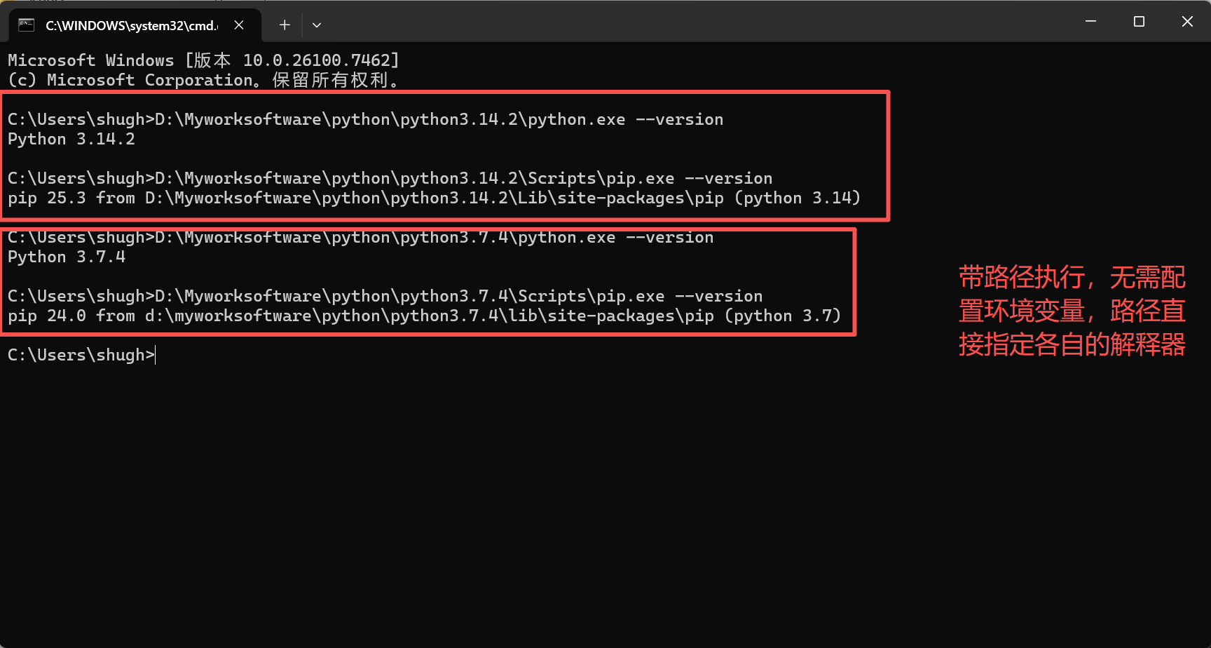 - 不同 Python 版本(3.7.4/3.14.2)对应各自的 python.exe
