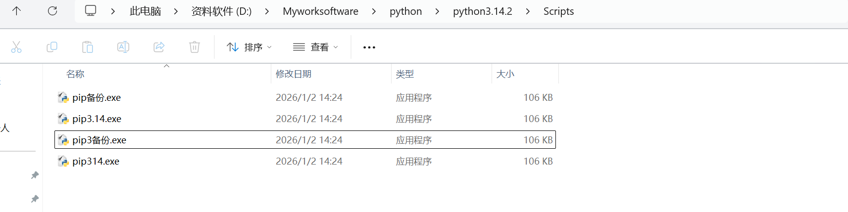 - 如下图,其实pip.exe和pip3.14.exe是同一个文件,名字不同,所以通过